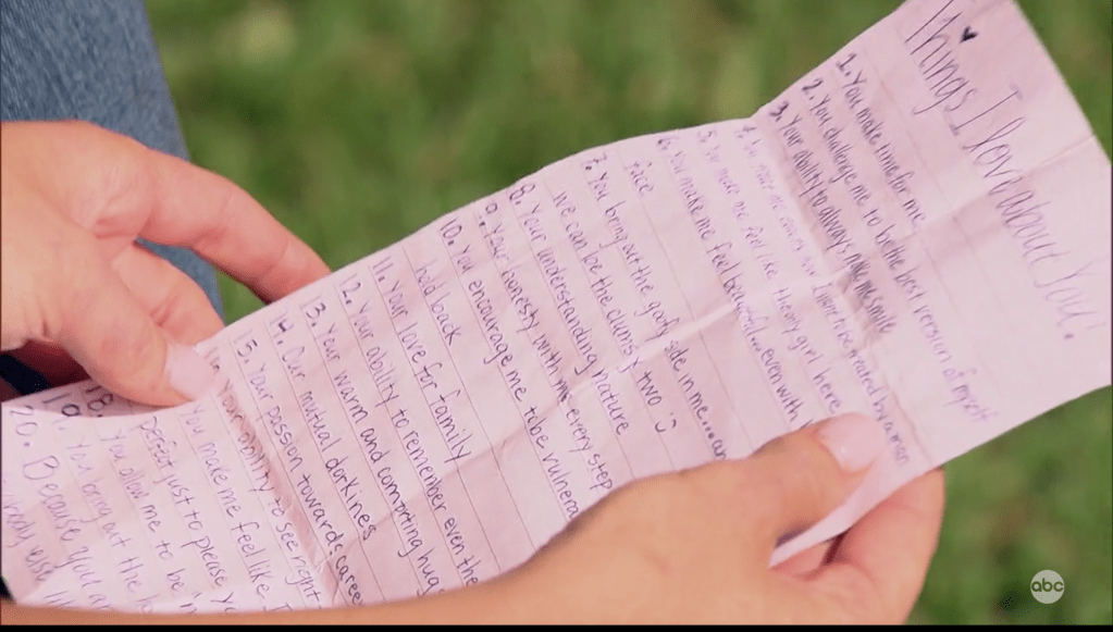 She gives Peter a list of TWENTY things she loves about him and I’m just like… I don’t know if I can come up with twenty things I love about my boyfriend I’ve been dating for two years…. JK ILY BAE, but you get my point. I do not believe you even know 20 facts, let along “things you love” about Peter at this point. But, OF COURSE, Peter eats this RIGHT UP and LICKS THE PLATE.