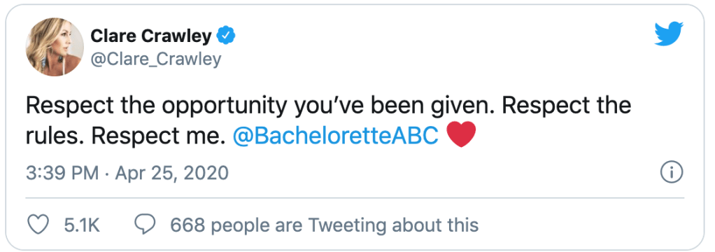 The at-the-time-Bachelorette (Season 16 of The Bachelorette is the first-ever time the franchise had multiple leads in one season, so the FIRST one), Clare, subtweeted (tweeting vaguely about someone specific, but not naming them – some may know this as “shade”) how one of the contestants on her future season was doing interviews & cameos (cameos are videos regular ole people can buy from “famous” people (whoever opts in if they have anyone who wants to buy them, really)). This was perceived by Clare as the “WRONG REASONS” since the season hadn’t even filmed yet.
