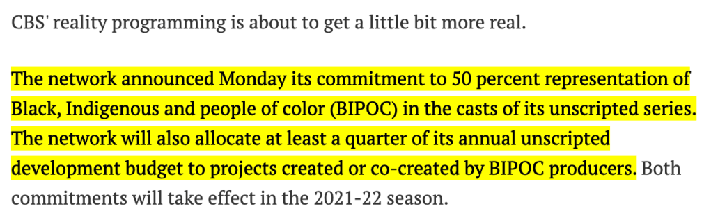 CBS (ABC does The Bachelor) announced this past summer that moving forward they’ll have a minimum 50% of their reality casts composed of BIPOC… I suggest ABC make a similar commitment! I’m pretty sure this season of The Challenge is like 80% BIPOC, and having so many different people (outside of races – different personalities, ages, where they’re from, etc.) makes the show five bazillion times better and more interesting to watch! We want to see people on TV that reflect our real life world!