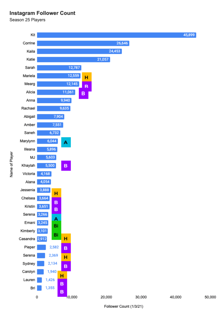 - Top 3 Follower Count S25 Players – 1) MVP: Kit (BY ALMOST DOUBLE THE NEXT CLOSEST PLAYER – 45.8K), 2) Corrine (26.7K), and 3) Kaila (24.5K). Katie is the only other contestant to have 20K club pre-season.