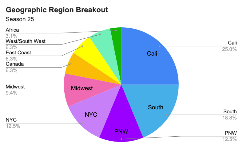 This season there’s a much larger Cali presence – the largest region bucket in S25 – 25% of the girls being from CA, followed by 18% of the girls from the South (vs. 47% in S24), then the third biggest region is Pacific Northwest (PNW, 12% of players) which is interesting because there were NO GIRLS FROM THERE ON S24 (I don’t remember there ever being such a big presence of people from this region… but everyone from there I have predetermined in my mind is dope and chill so I’m here for it! 37% West Coast presence!)