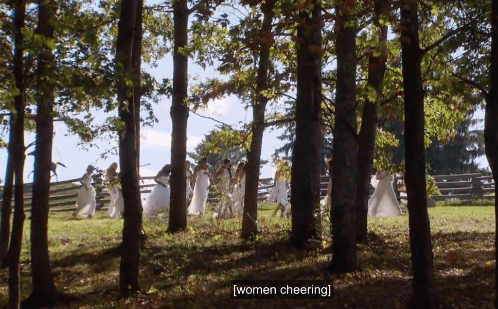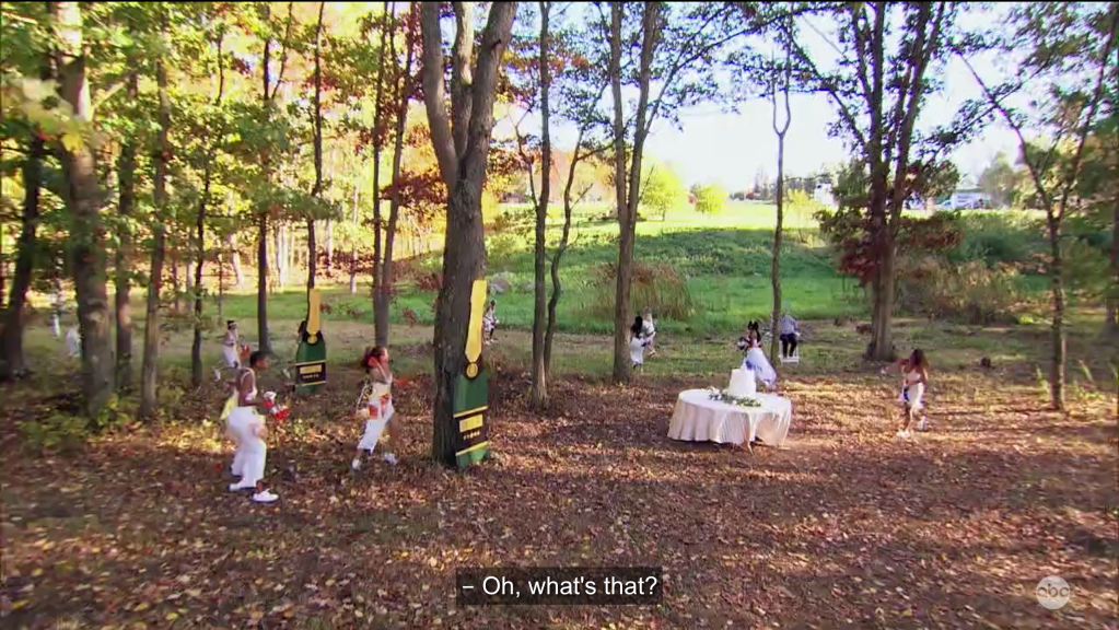 This entire group date is so cinematic, I LOVE IT. We see the women walking towards us from a sunny field to dark woods and again everything around it is so Hunger Gamesssssssssss.