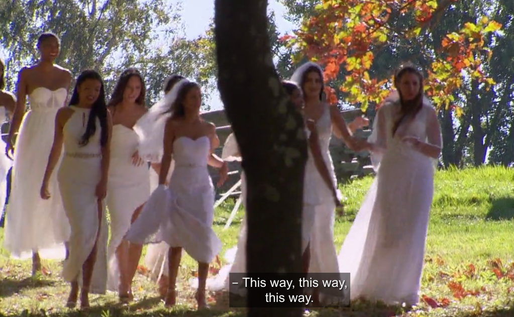 The girls come back out and it’s just slightly jarring to see twenty women in wedding dresses, LOL.
