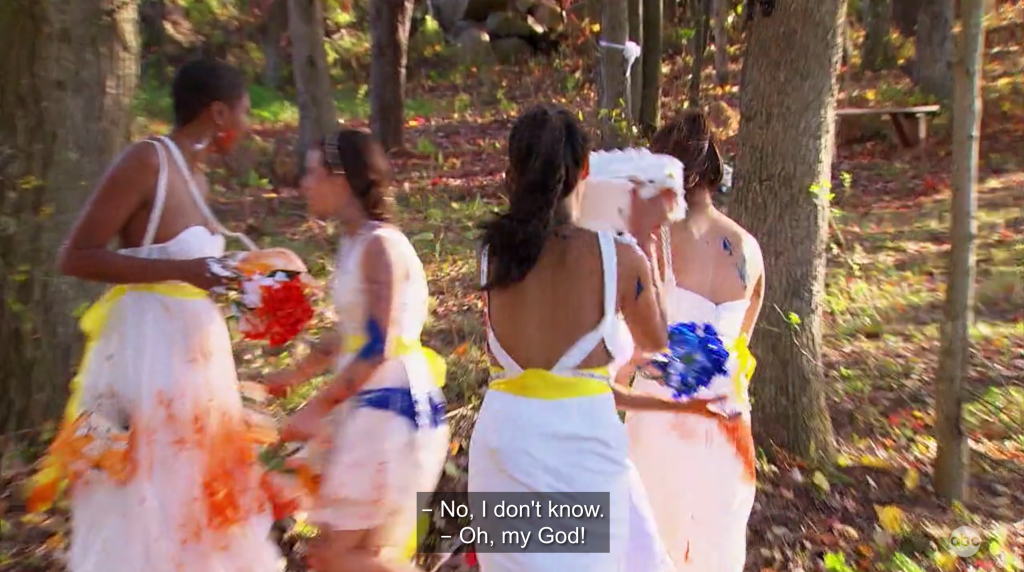 In the woods, Chris emphasizes this is FIGHT, Try to HURT each other if you can!!!! He reveals another Bachelor classic – Whichever team wins the “sports” game will get to spend the rest of the evening with Matt, and those that lose? Will have to go back to the house in their “busted-up dresses” and spend the rest of the night thinking, “I wonder who’s making out with Matt right now?” LMAO, CHRIS, WHY ARE YOU SUCH A SAVAGGGEEEEEE….. THAT WAS VERBATIM.