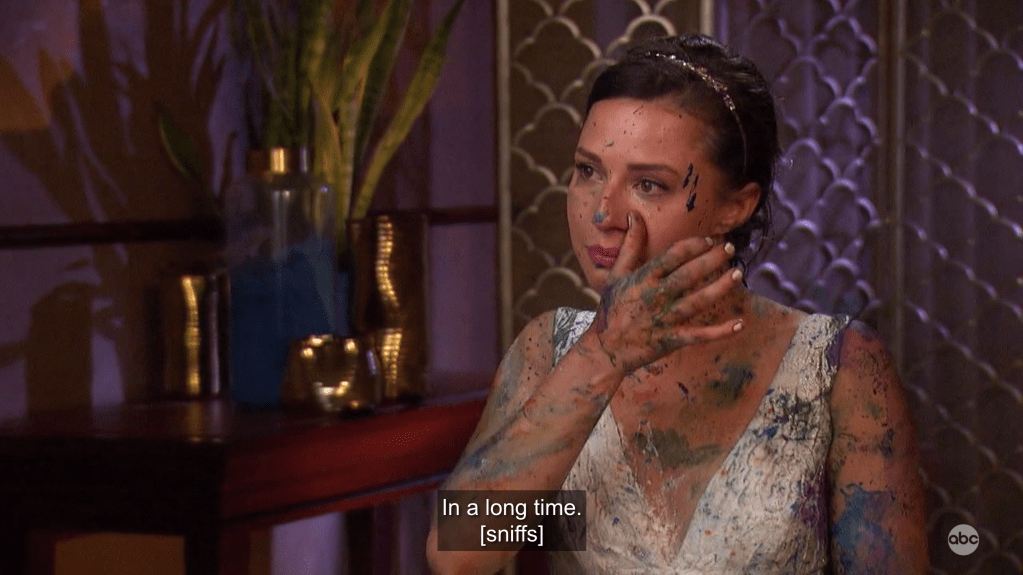 MJ wins the game for the red team, and Mari gets the “MVB” most valuable bride despite being on the yellow (losing) team. As her prize, she gets to join the winners in the night portion of the group date. The rest of the losing yellow team girls walk home very sad, very painted and very defeated.