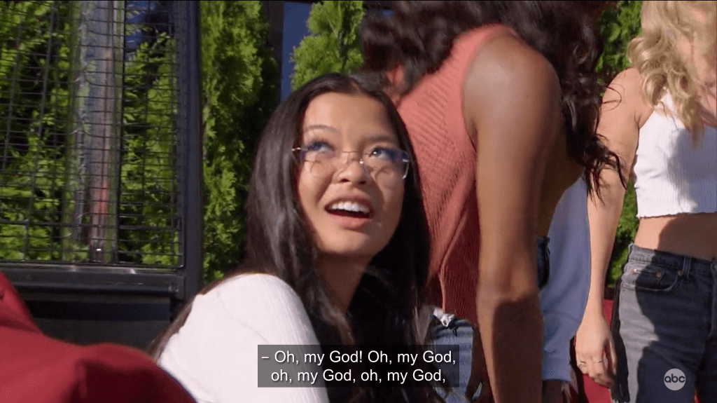 Before Chris explains what’s happening that week, he calls for his “girl” Abigail, the first impression rose recipient from Matt – “And the first kiss!!!!” Someone calls out (OKAY, UPON REWATCH, VICTORIA CALLS THIS OUT, MORE EVIDENCE THAT SHE IS A PRODUCER PLANT, HELPING NARRATE THE STORY, OR I WOULD EVEN BELIEVE SHE USED TO BE A PRODUCER AT THIS POINT, lmaooooo) Abigail innocently smiles, and says “Here!” as you do in elementary school when the teacher is taking attendance (LOL, or at least I did, unless you’re the ornery ass kid who said “present”.) Chris says, “Well, congratulations on both!” (To clear game “distinctions” or “honors” that tell us… Abigail is a front-runner in this race!)