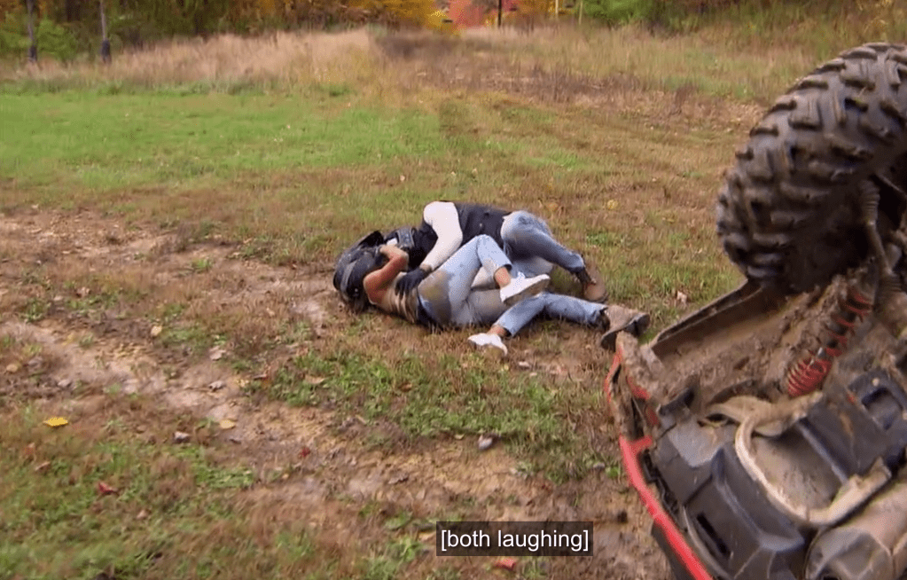 Bri and Matt ride around for a while on their separate ATV’s, but then Bri asks to hop onto the back of Matt’s ATV… seems safe and smart! Matt is like, “Do you trust me?”, and Bri’s like… yes, but she “shoulda said no” – Taylor Swift 🙂 No more than 3 seconds later, does Matt take a turn to fast and damn near crushing him and Bri tipping over the ATV!!!