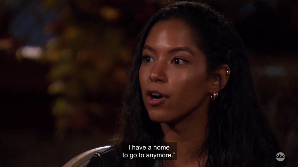 Jessenia doesn’t get specifically graphic but says her trauma is that she has dealt with a lot of infidelities. Then she starts to talk about her parents and gets “choked up” saying how they’ve been through so much in their lives. Decently, vague trauma play! Sorry bout your luck, Jess, but nice play!