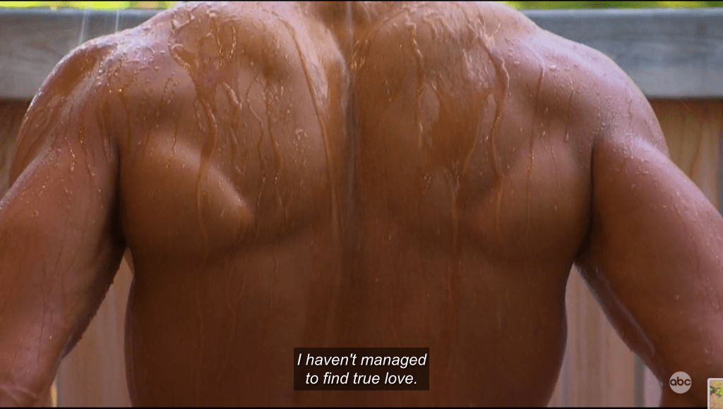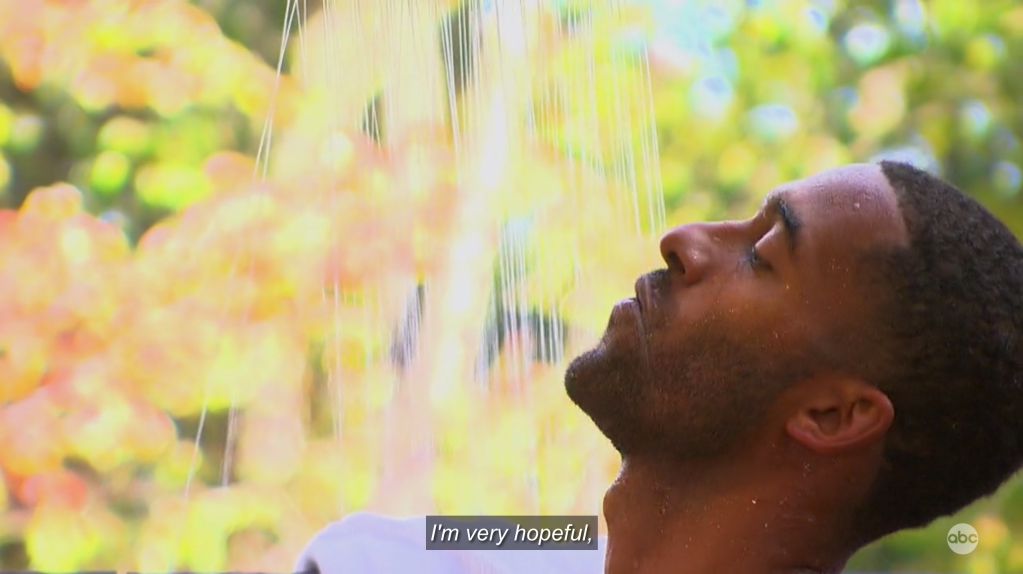 Now the episode really begins! It’s a beautiful foggy morning, Matt goes on a morning jog with the sun rising behind him (GORGO!) After his run, we get a … very extended shower scene… Similar to how GOR pointed out that Sean Lowe (17th Bachelor) was a super-Christian Bachelor and was super-objectified by the show as a sex object… In the same way, Matt, too, is proving super Christian, and also super-objectified as a sex object….