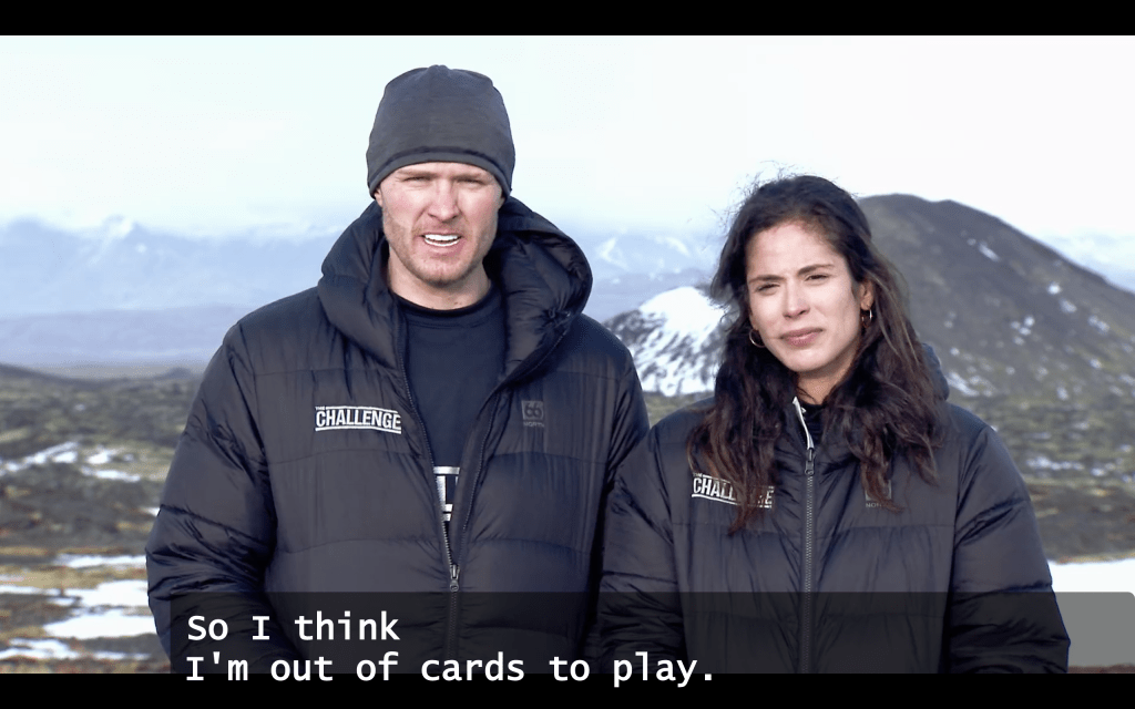Essentially, the girls have to run a “5-mile” trail, (which there’s some conjecture if it was 5 miles total or 5 miles each way? I feel like 5 miles total but then again… who KNOWS), stopping to complete puzzles along the way. Whoever gets their partner from the volcano & brings them back to complete the puzzle at the finish line first, wins & becomes the Double Agents… Now, THIS is a CHALLENGE – TJ calling it a “mini final”, which is it really kinda is – long-distance running combined with puzzles = Challenge final.