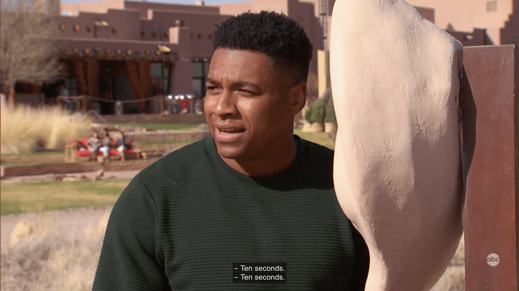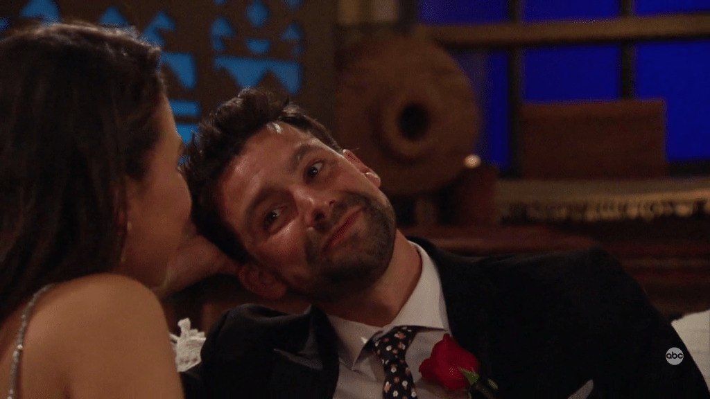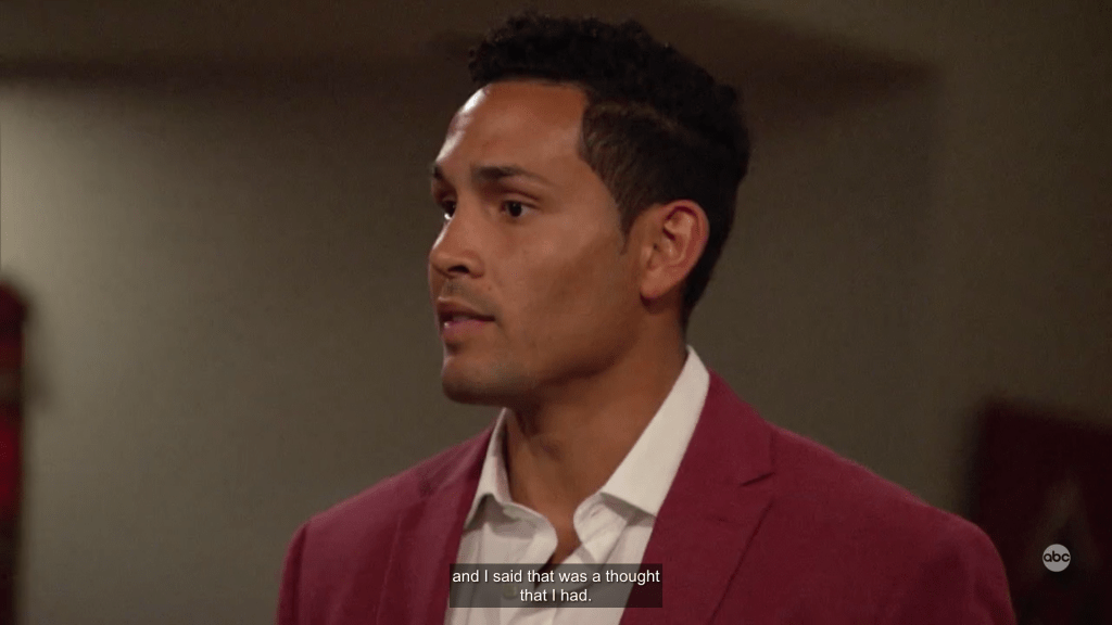 He goes on to say he knows things are being said about him in the house & how things have been hard for him. Everyone is “demonsterizing” him (LMAOOO, YES. I love The Bachelor’s long-standing tradition of creating new words – “befuddled”, “fianasco”, and now “demonsterized”!), but he is being tough. He says the guys can defame him all day long, but he’s there for her. Pretty good response, IMO!