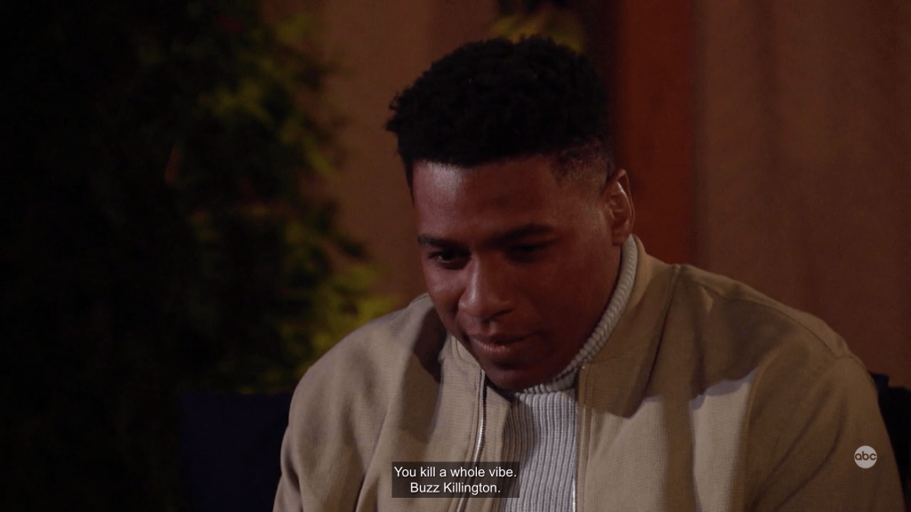 Tayshia & KB come out to deliver the “final rose” warning, ensue a dramatic pause… Everyone is looking around at each other, when another UNPRECEDENTED EVENT OCCURS – THE LEAD FUCKS UP A CONTESTANT MID-ROSE CEREMONY. She calls Thomas’ name & everyone, including Thomas, thinks this means he got a rose… Because usually, it does. But then she goes IN ON THIS MAN, absolutely tearing him a new asshole. She says, “You told me things that I wanted to hear, but what I learned about you tonight is that you’re selfish, unkind, and a liar. Your Bachelor audition ends tonight so get out.” DAMMMMMMMMMMMMMMMM.