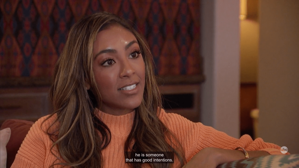 God, Tayshia is KILLING IN THAT ORANGE SWEATER GOD GOOD THIS WOMAN IS AMAZING.
