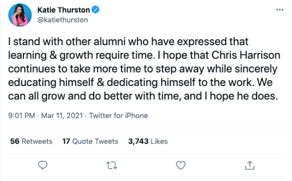 Before Katie’s season started filming (roughly early March-ish), Katie put out a tweet for all the world to see (or at least fans & then forcibly the producers) essentially boycotting Chris Harrison as the host of her season of the show. This kind of forced the producers to adhere to her wishes, as she’d already been announced as the next Bachelorette. Great play and move by Katie!